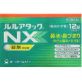 【製品名】 【指定第2類医薬品】ルルアタックNX 【内容量】 12錠 【使用上の注意】 ●してはいけないこと 1.次の人は服用しないで下さい。 (1)本剤又は本剤の成分によりアレルギー症状を起こしたことがある人 (2)本剤又は他のかぜ薬、解熱鎮痛薬を服用してぜんそくを起こしたことがある人 (3)15歳未満の小児 (4)出産予定日12週以内の妊婦 2.本剤を服用している間は、次のいずれの医薬品も使用しないで下さい。 他のかぜ薬、解熱鎮痛薬、鎮静薬、鎮咳去痰薬、抗ヒスタミン剤を含有する内服薬等(鼻炎用内服薬、乗物酔い薬、アレルギー用薬等)、胃腸鎮痛鎮痙薬 3.服用後、乗物又は機械類の運転操作をしないで下さい。 4.授乳中の人は本剤を服用しないか、本剤を服用する場合は授乳を避けて下さい。 5.服用前後は飲酒しないで下さい。 6.5日間を超えて服用しないで下さい。 ●相談すること 次に該当する人はお申し出下さい (1)医師又は歯科医師の治療を受けている人 (2)妊婦又は妊娠していると思われる人 (3)高齢者 (4)薬などによりアレルギー症状を起こしたことがある人 (5)次の症状のある人:高熱、排尿困難 (6)次の診断を受けた人:甲状腺機能障害、糖尿病、心臓病、高血圧、肝臓病、腎臓病、緑内障、全身性エリテマトーデス、混合性結合組織病 (7)次の病気にかかったことのある人:胃・十二指腸潰瘍、潰瘍性大腸炎、クローン病 【効能・効果】 かぜの諸症状(鼻水、鼻づまり、のどの痛み、せき、たん、発熱、悪寒、くしゃみ、頭痛、関節の痛み、筋肉の痛み)の緩和 【用法・用量】 次の1回量を1日3回、食後なるべく30分以内に服用して下さい。 成人(15歳以上):2錠 15歳未満:服用しないで下さい。 【成分 ・ 原材料】 6錠中 イブプロフェン 450mg、ベラドンナ総アルカロイド 0.3mg、クレマスチンフマル酸塩 1.34mg、ブロムヘキシン塩酸塩 12mg、ジヒドロコデインリン酸塩 24mg、 dl-メチルエフェドリン塩酸塩 60mg、無水カフェイン 75mg、 ベンフォチアミン(ビタミンB1誘導体) 25mg、リボフラビン(ビタミンB2) 12mg 添加物:トウモロコシデンプン、乳糖、セルロース、クロスカルメロースNa、ヒドロキシプロピルセルロース、ステアリン酸Mg、ポリビニルアルコール・アクリル酸・メタクリル酸メチル共重合体、タルク、酸化チタン、ヒプロメロース、カルナウバロウ 【保管及び取り扱い上の注意】 (1)直射日光の当たらない湿気の少ない涼しい所に保管して下さい。 (2)小児の手の届かない所に保管して下さい。 (3)他の容器に入れ替えないで下さい。(誤用の原因になったり品質が変わります) (4)表示の使用期限を過ぎた製品は使用しないで下さい。 【この製品についてのお問合せ先】 第一三共ヘルスケア株式会社 「お客様相談室」 0120-337-336 受付時間/9:00-17:00(土、日、祝日を除く) 【販売元】 第一三共ヘルスケア 【広告文責】 株式会社スターネット |