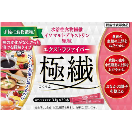 さっと手軽に食物繊維!水溶性食物繊維顆粒「エクストラファイバー極繊(ごくせん)」は、トリプルヘルスクレームの機能性表示食品です。