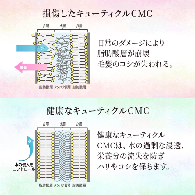 アミノ酸系成分『ナノファイバージェル※』が傷んだキューティクルCMCを効果的に補修し、使い続けるほどにうるツヤ髪を実現。
